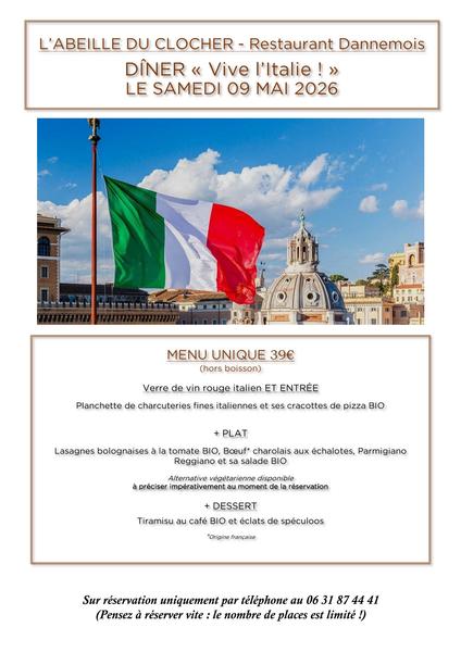 L'Abeille du Clocher vous invite à un dîner spécial « Vive l'Italie ! » le samedi 9 mai 2026. Au menu, un verre de vin rouge italien et une planchette de charcuteries fines italiennes avec ses cracottes de pizza BIO en entrée. Le plat principal sera composé de lasagnes bolognaises à la tomate BIO, de bœuf charolais aux échalotes, de Parmigiano Reggiano et de sa salade BIO. Pour finir en douceur, un tiramisu au café BIO et éclats de spéculoos vous sera servi. N'oubliez pas de préciser si vous souhaitez l'alternative végétarienne lors de votre réservation. Le nombre de places est limité, réservez vite !